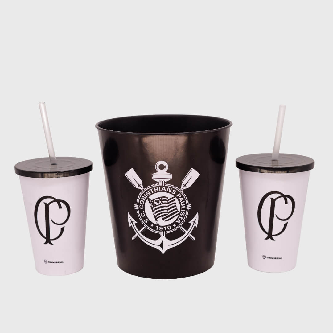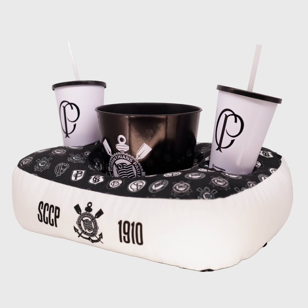 Kit Pipoca Corinthians – diversão garantida para os torcedores! Acompanha 1 balde, 2 copos e uma almofada de suporte, perfeito para assistir aos jogos com conforto e muito estilo alvinegro